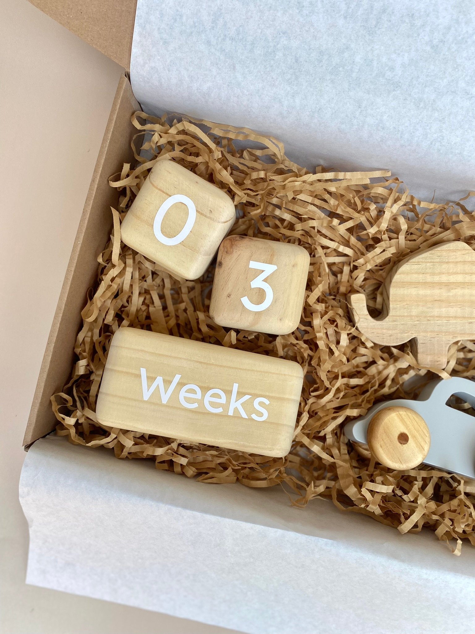 - Cubo de hitos: Bloques de madera con números y palabras para marcar semanas, meses y años.